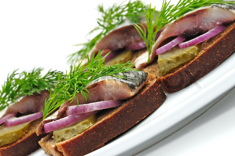 Rooster het brood kort in de broodrooster, besmeer 4 sneetjes met de kwark. Snijd de paprika en augurk in kleine stukjes en meng met de kruiden en het citroensap. Verdeel dit over 2 sneetjes brood. Haal de kop en staart van de sprotjes en verdeel over dezelfde sneetjes brood. Bestrooi met de bieslook en garneer met de uienringen. Leg de andere sneetjes erop met de kwarkzijde aan de onderkant en snijd diagonaal doormidden. Zet vast met een prikker.