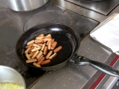 4 Klaar | Schil de pastinaken en snijd ze in kleine blokjes. Kook de blokjes direct (tegen verkleuring) beetgaar in het kokende water. Spoel ze koud onder de koude kraan. |