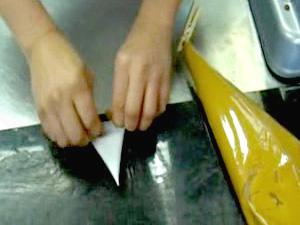 Maak voor het blaadje een wiegende beweging naar beneden. Haal vervolgens het puntje van de cornet door het blaadje.