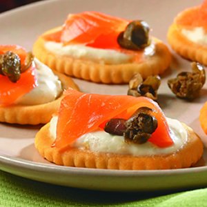 2 Klaar | Beleg de crackers met boter en leg daarop de stukjes vis met wat saus |