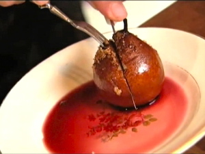 1 Klaar | Voor de mangochutney. Schil de mango’s. Snijd het vruchtvlees van de pitten en snijd het vervolgens in blokjes. Schil de gemberwortel en snijd hem fijn. Pel de teentjes knoflook en snijd ze eveneens fijn. |