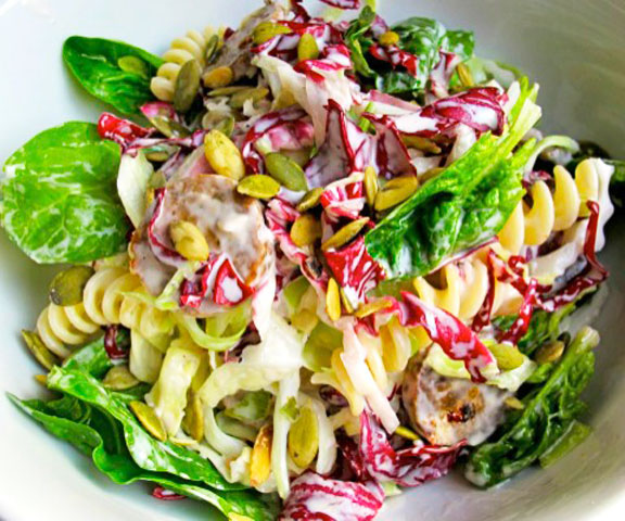 6 Klaar | Doe de pasta in een kom en voeg de kip toe |