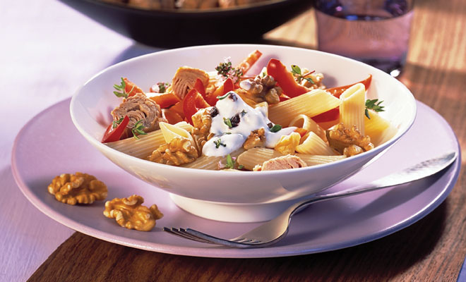 5 Klaar | Maak de dressing door de walnoten en het sap van de sinaasappel in een keukenmachine tot een glad mengsel te malen |