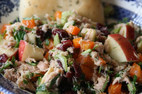 4 Klaar | Hark met een vork de tonijn los en voeg toe, samen met de blokjes tomaat |