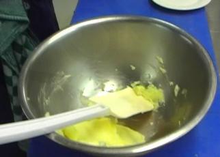 Zet de ui en spek aan (in een pan met boter bakken). Bak de ui met de spek tot het glazig is.